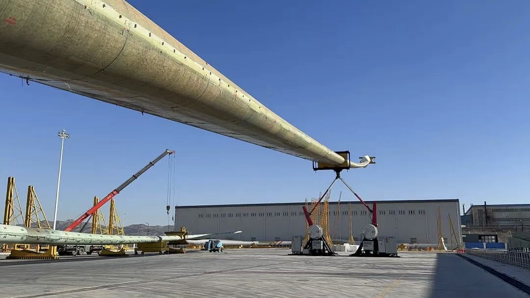 叶片双轴激振测试设备由三一重能自主设计研发,于2024年1月投入使用,是中国首台具有自主知识产权的叶片双轴疲劳试验设备,并获得DNV权威认证。通过将挥舞和摆振载荷“合二为一”,该试验设备不仅能精准复现叶片真实运行中的复杂受力状态,更将单只叶片验证周期缩短30%以上,为大型风电叶片的优化迭代、技术创新提供了坚实支撑。