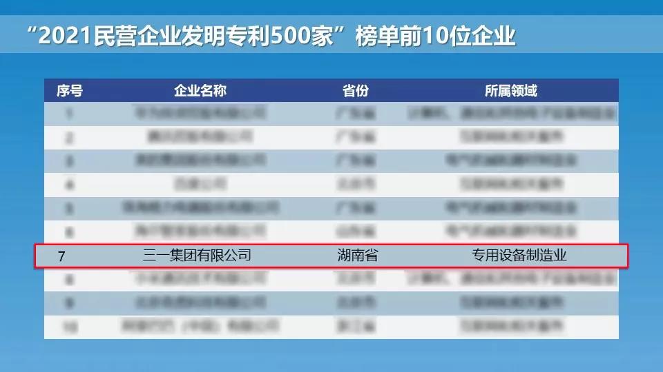 “2021民营企业发明专利500家”榜单入围门槛为拥有有效发明专利49件。截至2020年底,三一集团共拥有国内有效专利9541项,其中有效发明专利6893项,强势跻身榜单前10,排名第7,同样是榜单前10位中唯一的专用设备制造企业。