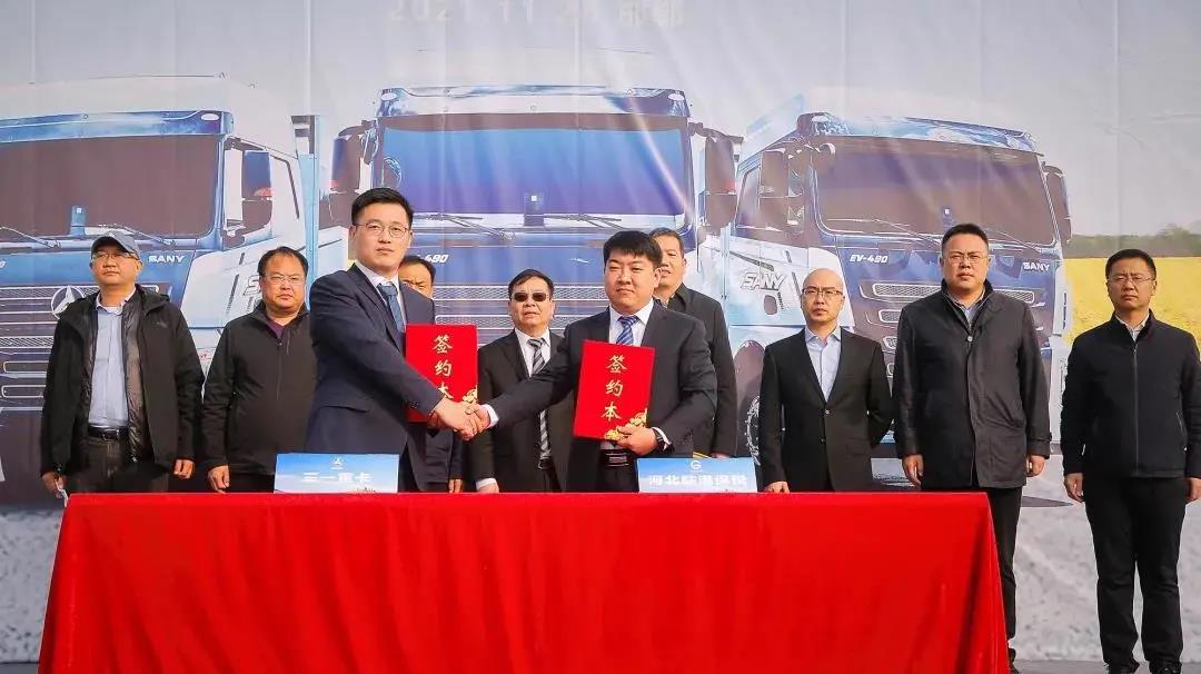 11月28日,三一重卡与河北陆港保税物流公司在河北武安签署500台新能源卡车战略采购协议。武安市政府党组成员、工业园区党工委书记、管委会主任胡存喜,河北陆港保税物流有限公司董事长张城久,三一集团副总裁周万春等出席签约仪式。