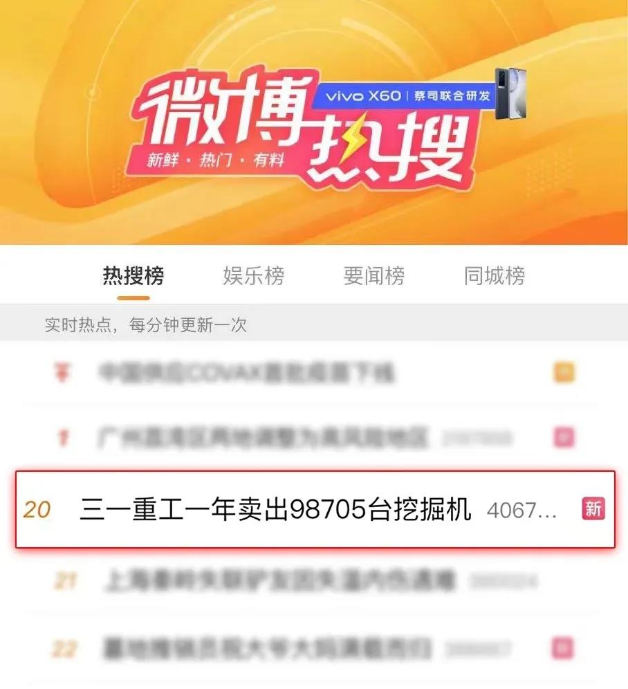 庆典当晚,三一集团官方公众号相关文章阅读量迅速突破10万+,刷爆朋友圈,三一挖掘机首夺全球销量冠军迅速冲上微博热搜,相关话题超1.4亿。