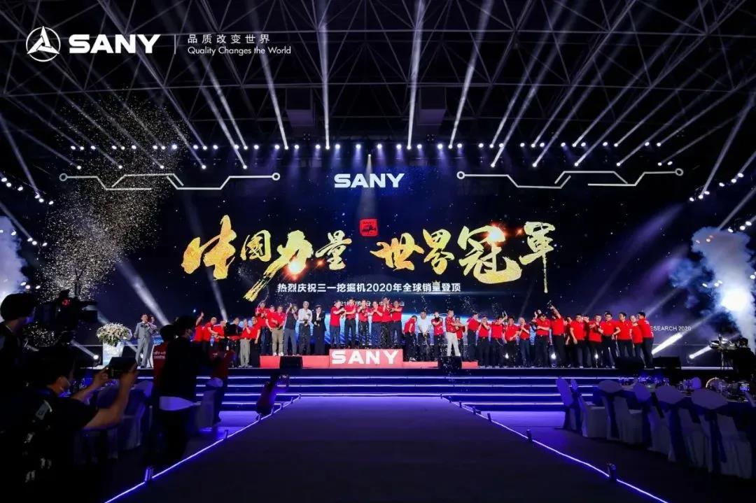 2021年5月31日,三一挖掘机全球销量登顶庆功晚会在昆山举行,共庆三一2020年挖掘机销售达98705台,占据全球市场15%份额,站上世界之巅。