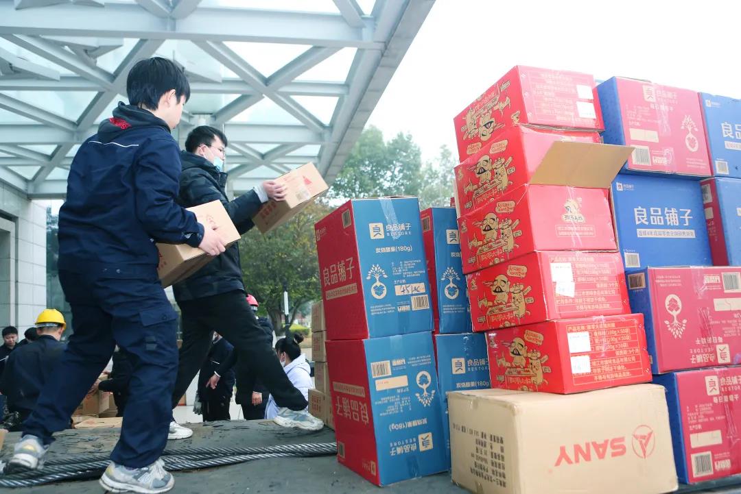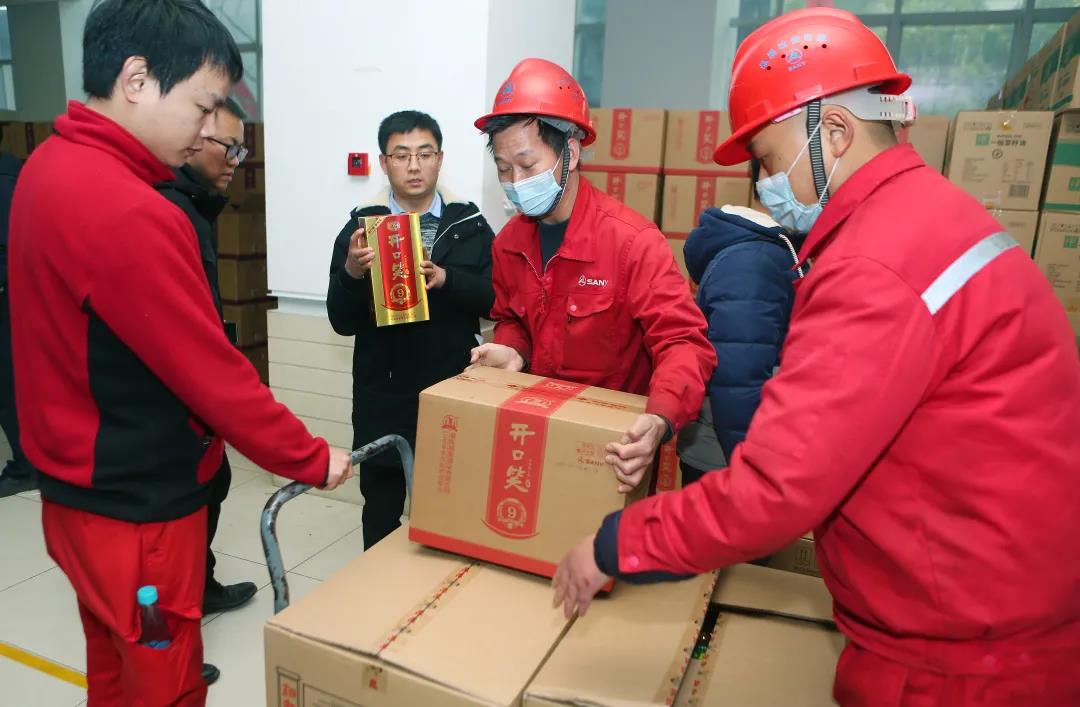 “快点过来帮忙搬,轮到我们领物资啦!”最近这几天,三一食堂一楼喜气洋洋,年货堆成了一座小山,满载“三一红”大礼包的手推车来回穿梭,将新春物资送往员工手中。